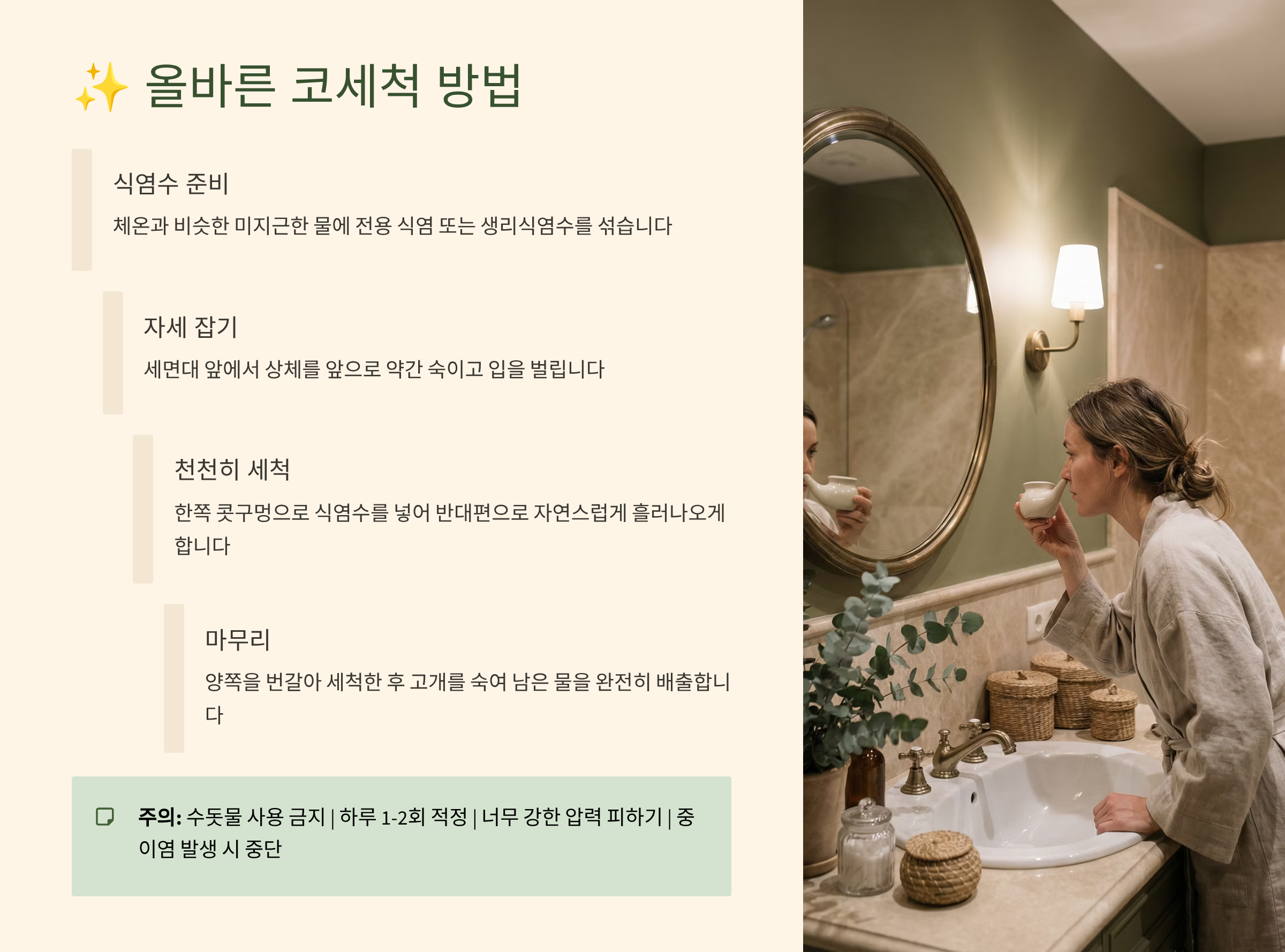 ⚠️ 면책조항: 이 글은 일반적인 정보 제공을 목적으로 작성되었으며, 의학적 조언을 대체할 수 없습니다. 개인의 건강 상태에 따라 적용이 다를 수 있으므로, 코세척 시작 전 반드시 의료 전문가와 상담하시기 바랍니다. 특히 기존 질환이 있거나 증상이 지속되는 경우 전문의 진료를 받으시길 권합니다.