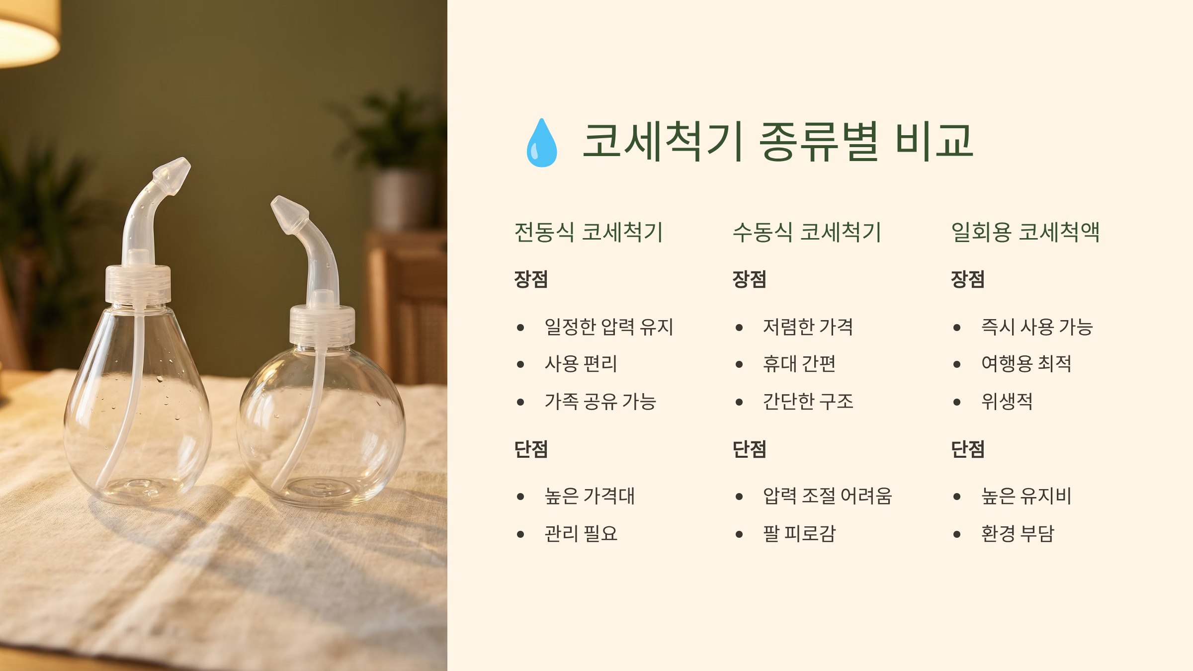 코세척기를 구매하기 전에 가장 먼저 고려해야 할 것은 사용 목적이에요. 단순한 코막힘 해결인지, 만성 비염 관리인지, 알레르기 예방인지에 따라 선택이 달라져요. 증상이 심하다면 전동식이, 가벼운 관리 목적이라면 수동식이 적합해요.