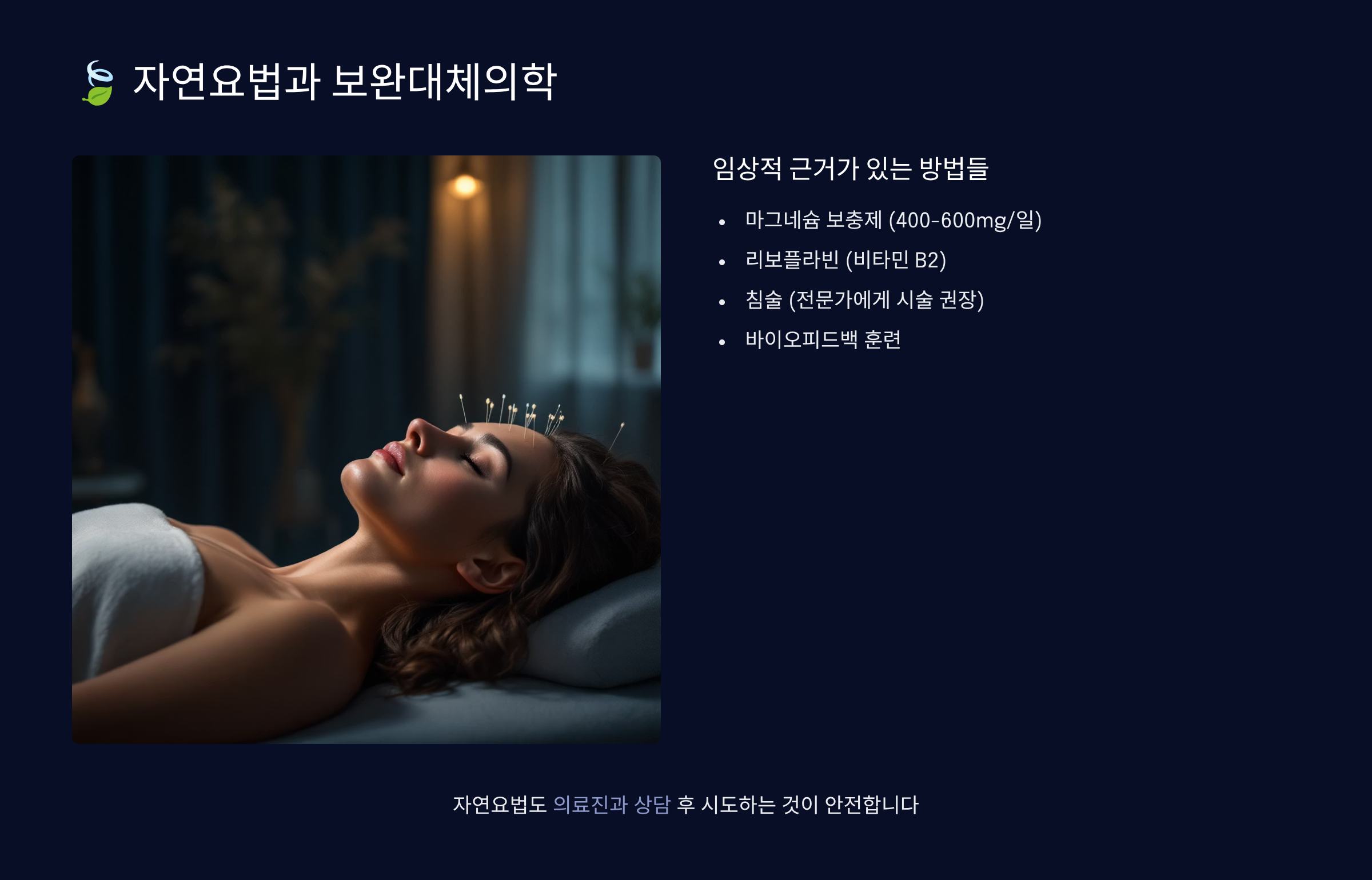 자연요법은 편두통 관리에 있어 약물 치료를 보완하는 중요한 역할을 해요. 침술은 가장 널리 연구된 보완요법 중 하나로, 전통 한의학에서는 기의 흐름을 조절해 두통을 완화한다고 설명해요. 현대 의학적으로는 엔도르핀 분비를 촉진하고 신경전달물질을 조절하는 효과가 있다고 알려져 있답니다. 주 1-2회, 8-12주간의 치료가 일반적이며, 숙련된 한의사에게 시술받는 것이 중요해요. 연구에 따르면 침술은 편두통 빈도를 20-40% 감소시킬 수 있어요.