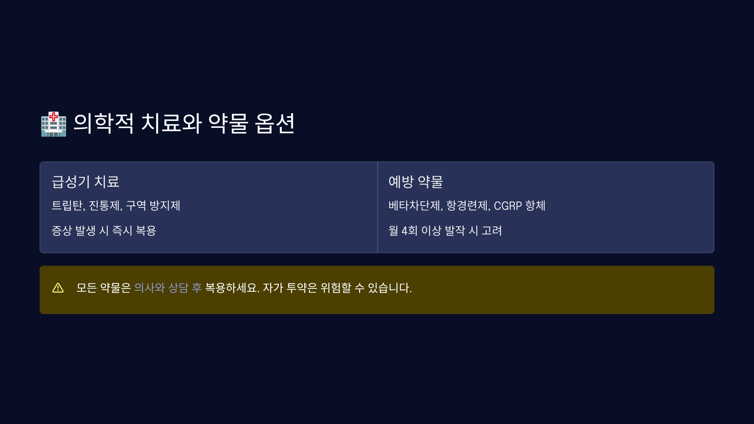이 글은 일반적인 정보 제공을 목적으로 작성되었으며, 의학적 조언을 대체할 수 없습니다. 편두통 증상이 있으시다면 반드시 전문의와 상담하시기 바랍니다. 개인의 건강 상태에 따라 치료법이 다를 수 있으며, 자가 진단이나 자가 치료는 위험할 수 있습니다.
