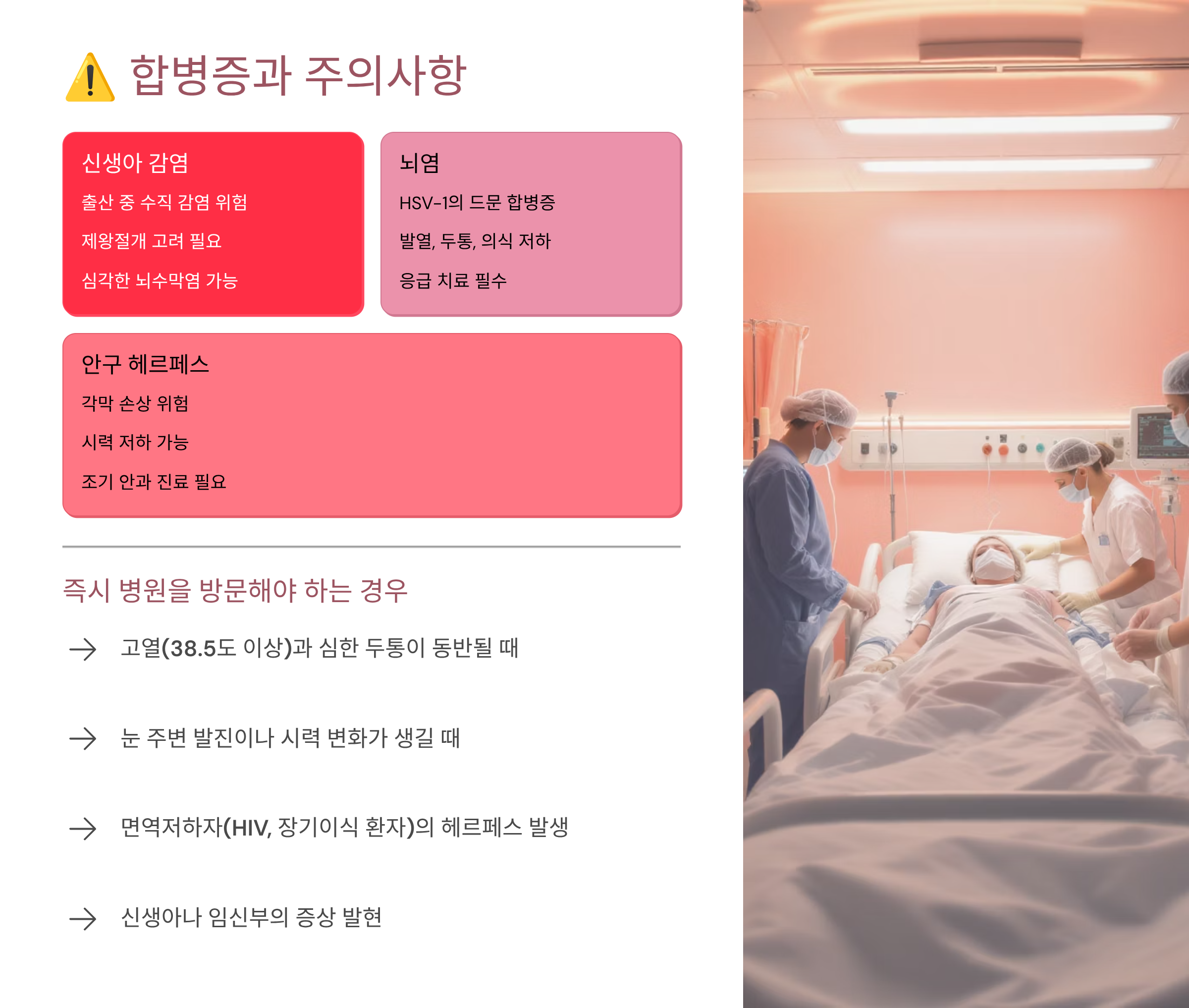헤르페스 뇌염은 매우 드물지만 생명을 위협할 수 있는 합병증이에요. 주로 신생아나 면역력이 심각하게 저하된 사람에게서 발생하며, 고열, 두통, 의식 저하, 경련 등의 증상이 나타나요. 즉시 응급 치료를 받아야 하며, 조기에 치료하면 예후가 좋아질 수 있어요. 임산부가 헤르페스에 감염된 경우, 출산 시 신생아에게 전파될 위험이 있으므로 의료진과 충분한 상담이 필요해요.