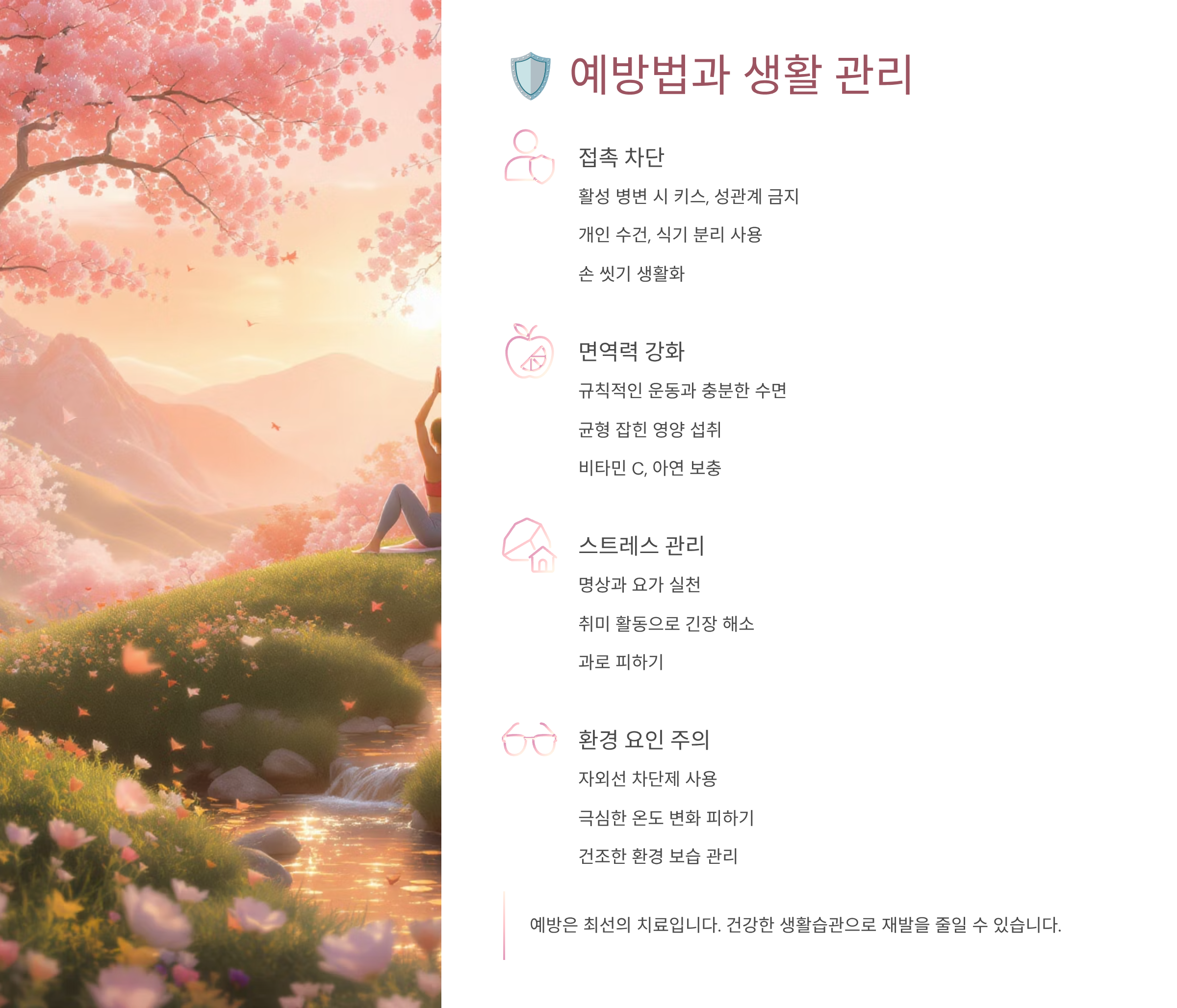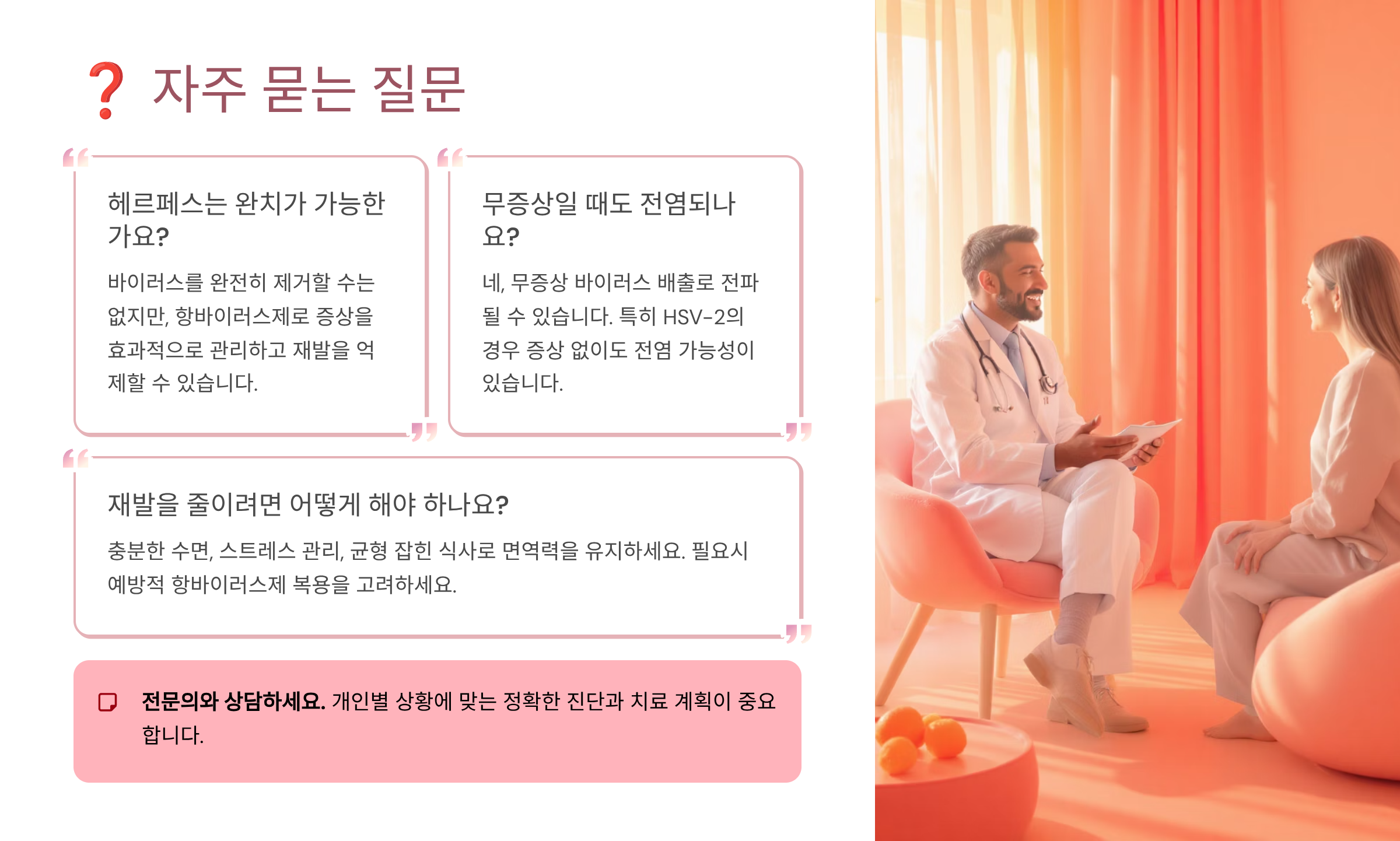 면책조항: 이 글은 일반적인 정보 제공을 목적으로 작성되었으며, 의학적 조언을 대체할 수 없습니다. 헤르페스 증상이 의심되거나 건강 상태에 대한 우려가 있으시면 반드시 의료 전문가와 상담하시기 바랍니다. 개인의 건강 상태와 병력에 따라 치료 방법이 달라질 수 있으므로, 자가 진단이나 자가 치료는 피하시고 전문의의 진료를 받으시길 권합니다.