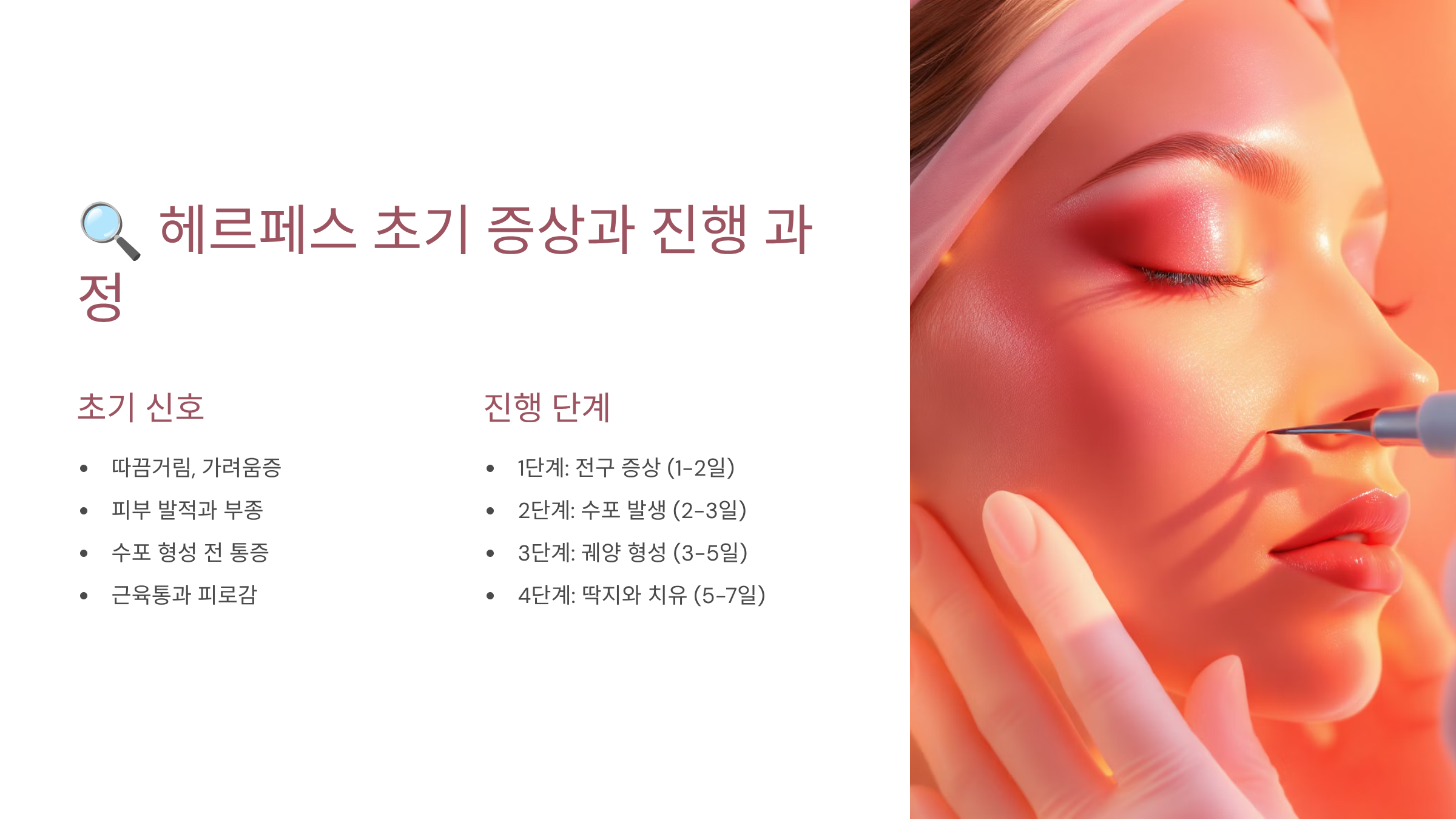헤르페스 초기 증상은 감염 후 2-12일 사이에 나타나기 시작해요. 처음에는 감염 부위에 따끔거리거나 가려운 느낌이 들면서 시작되는데, 이를 전구 증상이라고 불러요. 많은 사람들이 이 시기를 단순한 피부 트러블로 오해하기 쉬운데, 바로 이때가 치료의 골든타임이랍니다. 전구 증상이 나타나면 24시간 이내에 작은 수포들이 군집을 이루며 나타나기 시작해요.