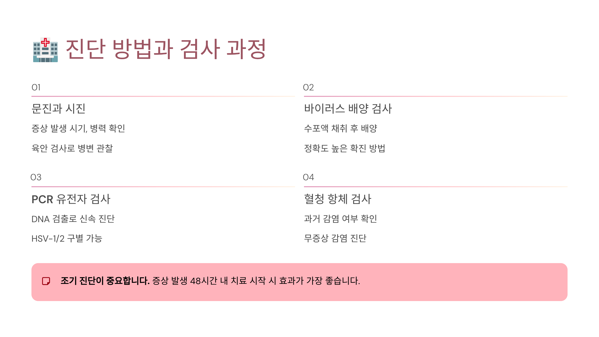 PCR 검사는 현재 가장 민감하고 정확한 검사 방법이에요. 바이러스의 DNA를 검출하는 방법으로, 매우 적은 양의 바이러스도 발견할 수 있어요. 또한 HSV-1과 HSV-2를 구별할 수 있어 치료 계획을 세우는 데 도움이 되어요. 결과도 1-2일 내에 나오기 때문에 빠른 진단이 가능하답니다. 2025년 현재는 많은 병원에서 PCR 검사를 기본으로 시행하고 있어요.