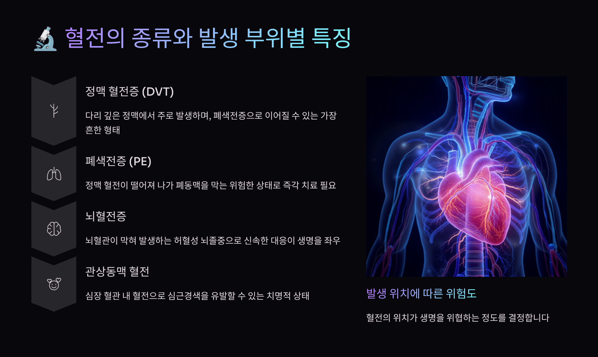 혈전은 특히 다리 정맥에서 자주 발생하는데, 이를 심부정맥혈전증이라고 불러요. 이 혈전이 떨어져 나가 폐로 이동하면 폐색전증이라는 생명을 위협하는 상황이 될 수 있어요. 그래서 혈전의 초기 증상을 알아차리고 적절한 예방과 치료를 받는 것이 정말 중요하답니다.