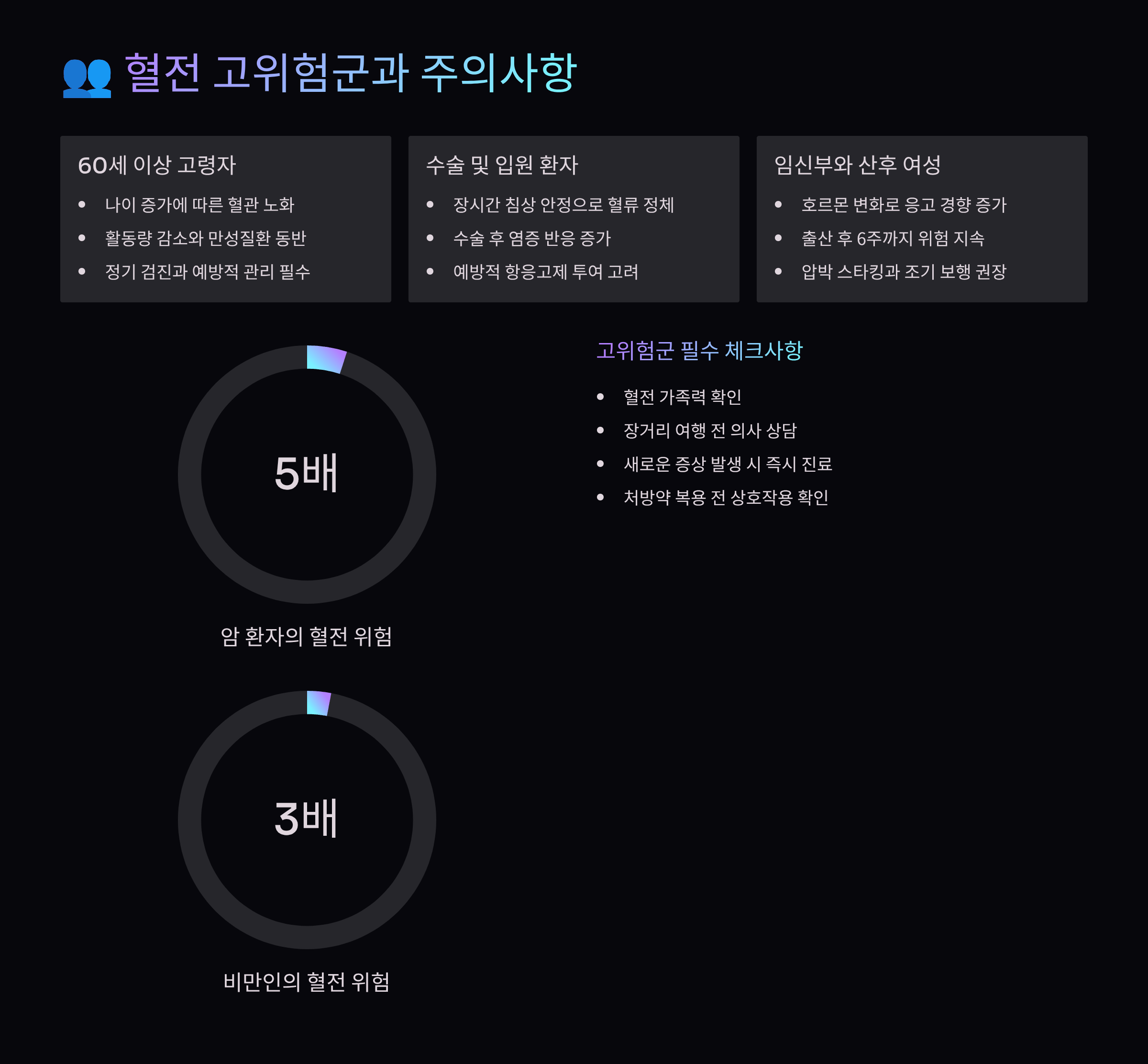 고령자는 여러 위험 요인이 복합적으로 작용해요. 65세 이상에서 혈전 발생률이 급격히 증가해요. 활동량 감소, 만성질환, 다약제 복용 등이 원인이에요. 낙상 위험 때문에 항응고제 사용이 조심스러울 수 있지만, 적절한 용량 조절과 모니터링으로 안전하게 사용할 수 있어요.