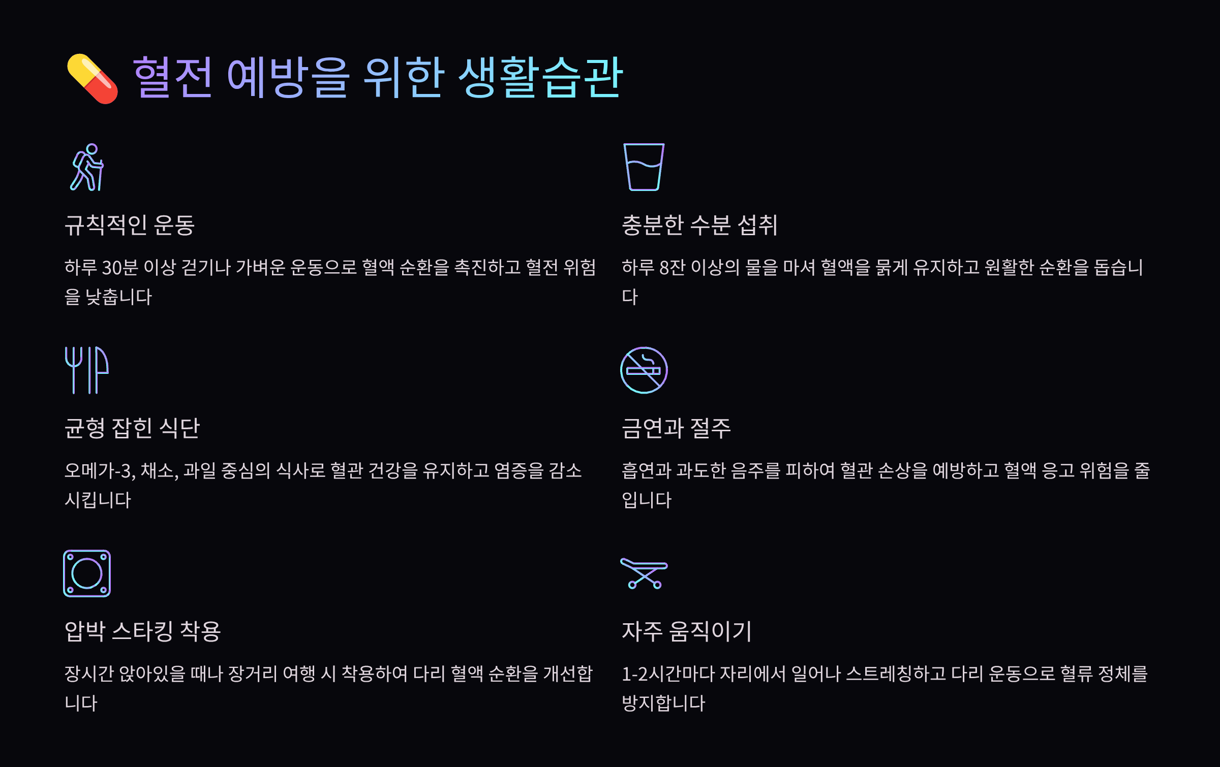 | 장시간 부동 | 높음 | 1-2시간마다 스트레칭 |