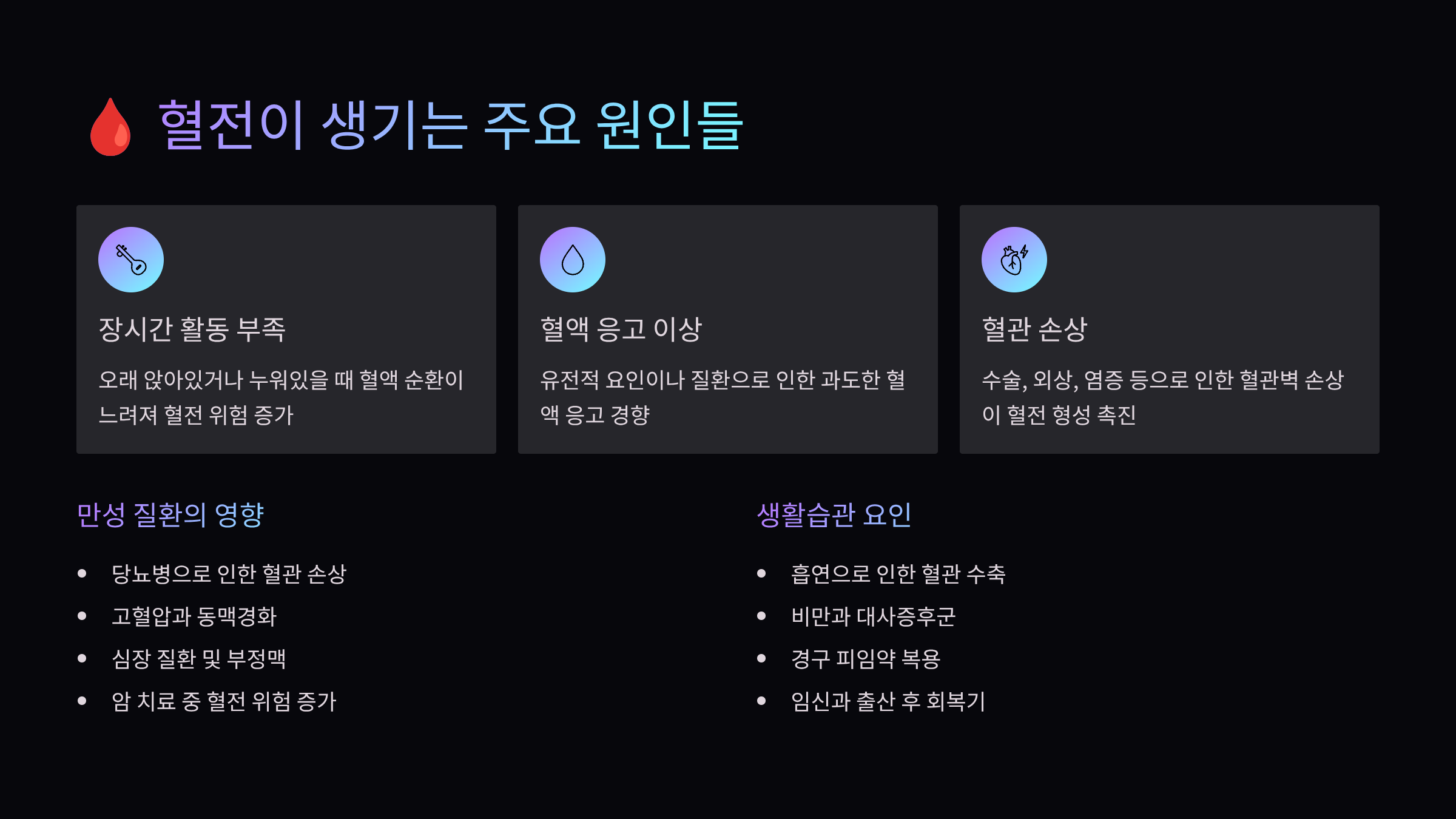 혈전은 우리 몸의 혈관 속에서 피가 굳어진 덩어리를 말해요. 정상적으로는 상처가 났을 때 출혈을 막기 위해 혈액이 응고되는 건 필요한 과정이에요. 하지만 혈관 내부에서 불필요하게 혈전이 생기면 혈액 순환을 방해하고 심각한 건강 문제를 일으킬 수 있답니다. 오늘은 혈전이 생기는 원인부터 예방법까지 자세히 알아볼게요! 😊