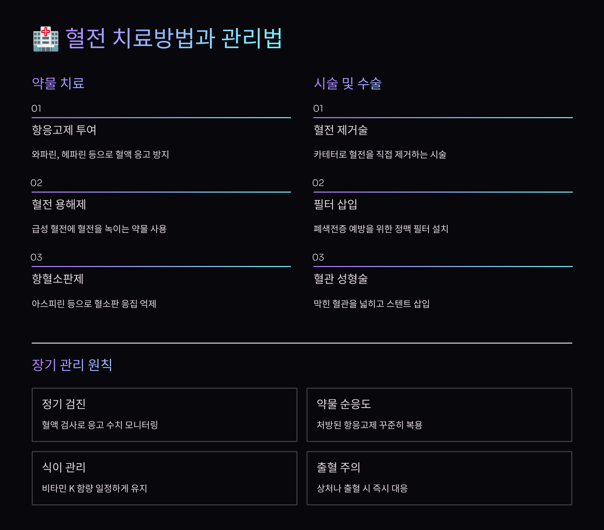 혈전 치료의 기본은 항응고제 투여예요. 헤파린, 와파린, NOAC(새로운 경구 항응고제) 등이 사용돼요. 급성기에는 주사제인 헤파린을 사용하고, 안정되면 경구약으로 바꿔요. 최근에는 리바록사반, 아픽사반 같은 NOAC가 많이 사용되는데, 와파린보다 편리하고 부작용이 적어요. 💊