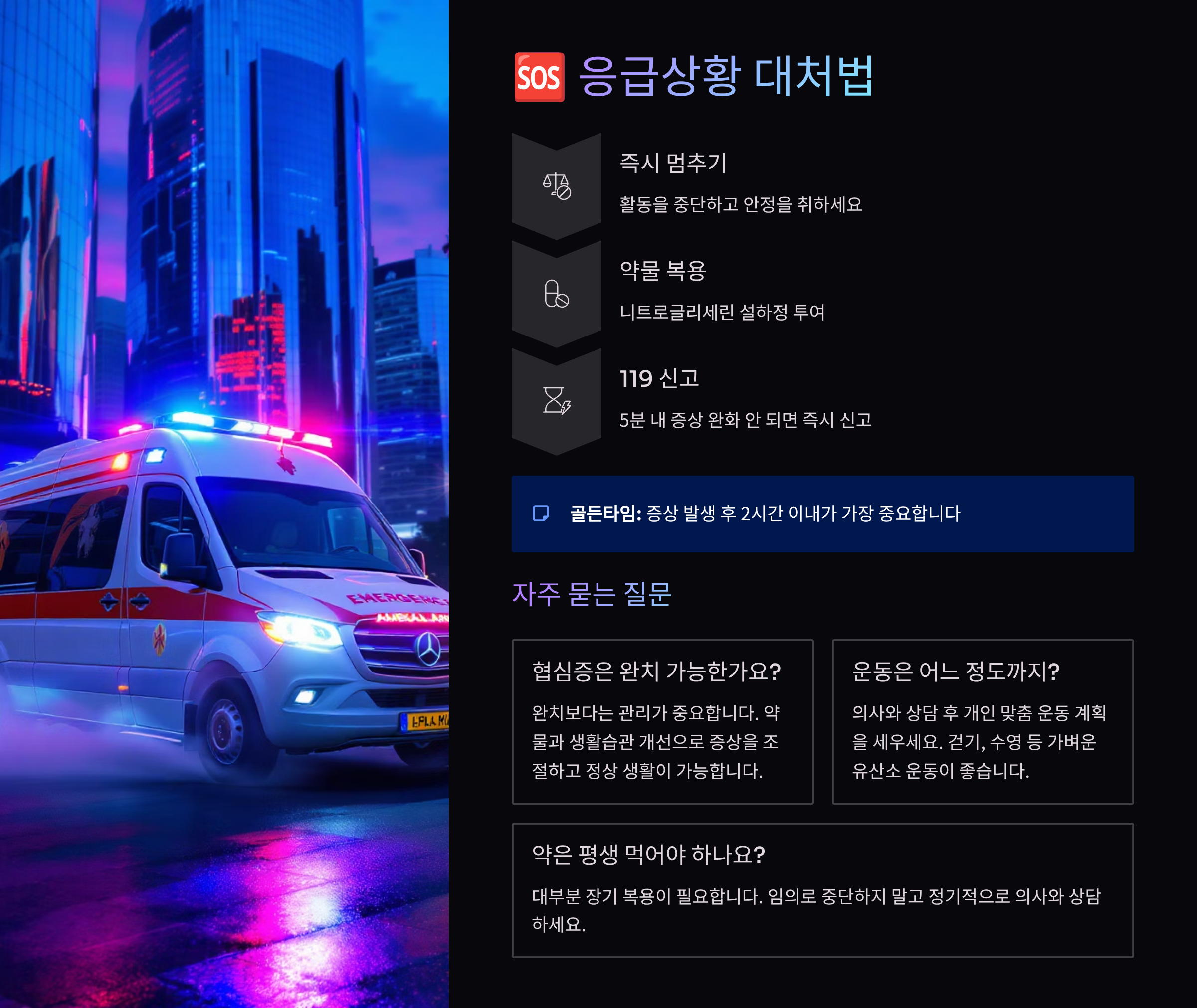 | 15분 이상 흉통 | 119 즉시 연락 | 심근경색 의심 |