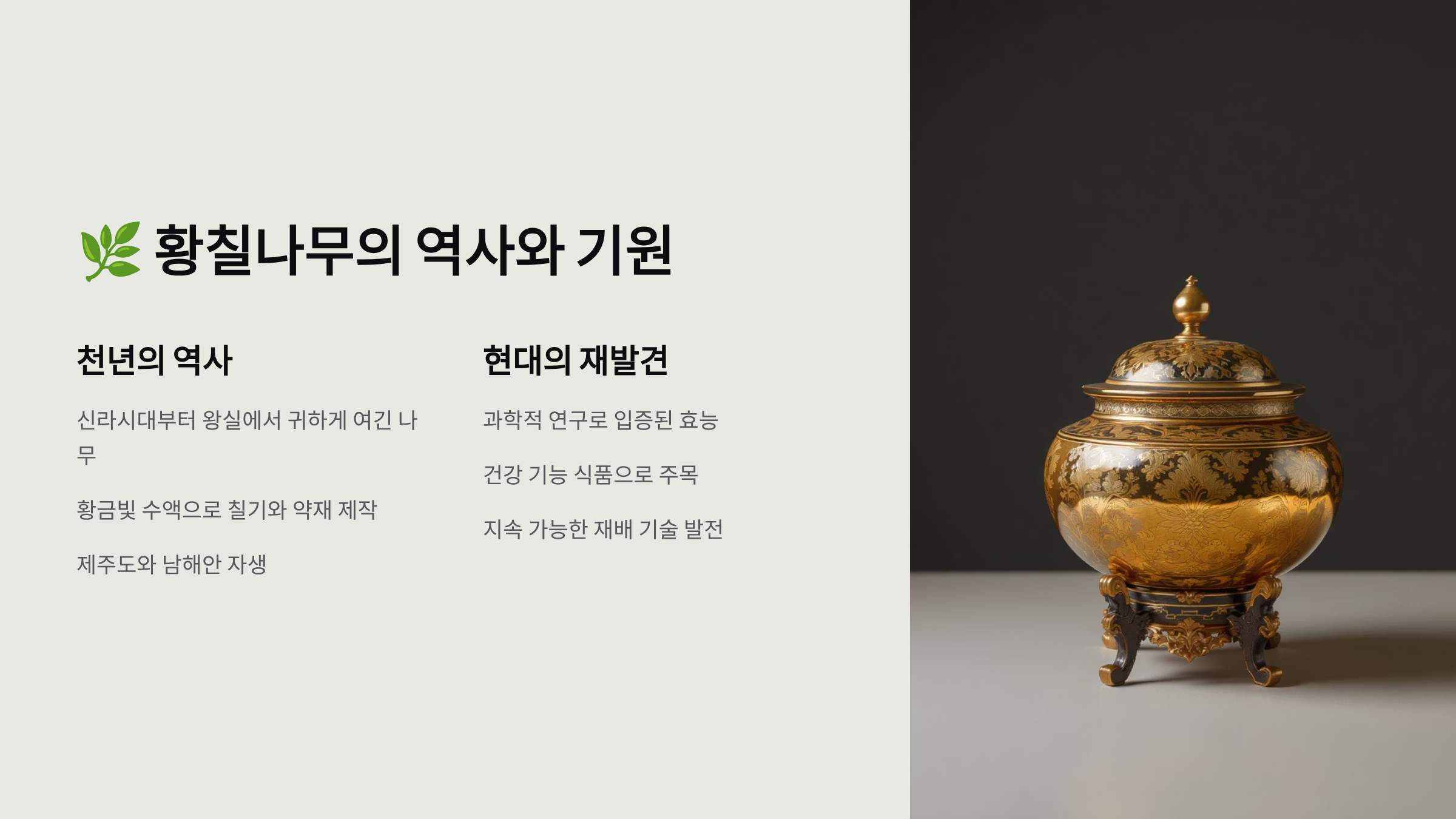 일제강점기에는 일본이 황칠나무를 대량으로 벌목해 가면서 개체수가 급격히 줄어들었어요. 해방 이후에도 무분별한 벌목으로 멸종 위기에 처했다가, 1990년대부터 본격적인 보호와 재배가 시작되었답니다. 현재는 전남 지역을 중심으로 황칠나무 재배단지가 조성되어 있고, 다양한 건강기능식품으로 개발되고 있어요.