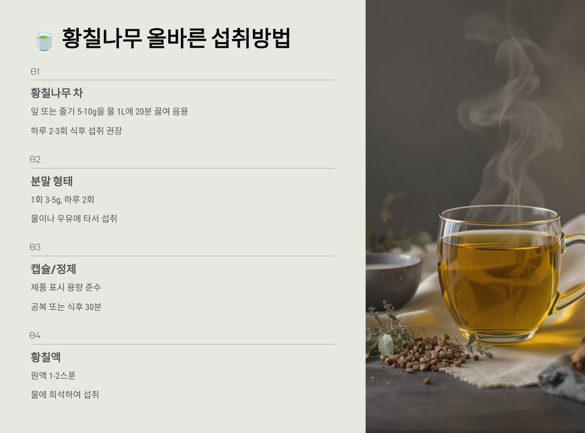 황칠나무를 효과적으로 섭취하는 방법은 여러 가지가 있어요. 가장 일반적인 방법은 차로 마시는 것인데, 황칠나무 차는 은은한 향과 부드러운 맛으로 누구나 쉽게 즐길 수 있답니다. 황칠나무 잎차를 만들 때는 80도 정도의 물에 2~3분간 우려내는 것이 좋아요. 너무 뜨거운 물을 사용하면 영양성분이 파괴될 수 있으니 주의해야 해요.