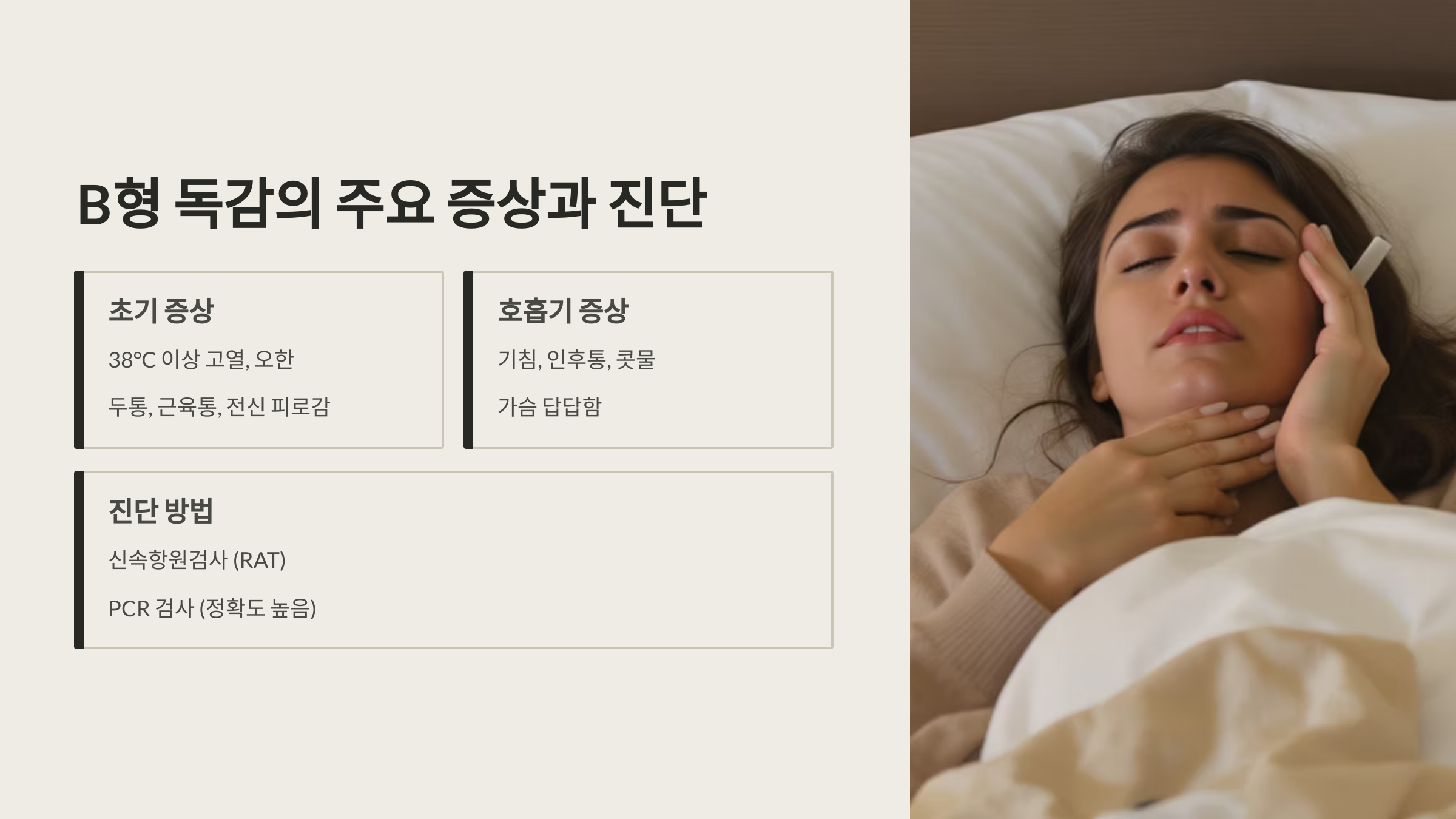 나의 생각으로는 B형독감과 다른 호흡기 질환을 구별하는 것이 중요해요. 일반 감기는 서서히 시작되고 발열이 미미한 반면, B형독감은 갑작스럽게 시작되고 고열이 특징이죠. 코로나19와도 구별이 필요한데, 코로나19는 미각이나 후각 소실이 특징적이고 B형독감은 근육통과 소화기 증상이 더 흔해요. 정확한 진단을 위해서는 의료기관을 방문해서 전문의의 진료를 받는 것이 가장 좋답니다. 🏥