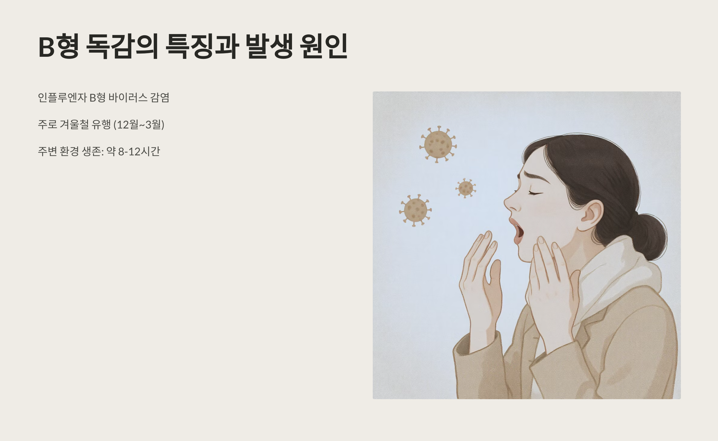 B형독감은 매년 겨울철에 우리를 괴롭히는 계절성 독감의 한 종류예요. 인플루엔자 B 바이러스에 의해 발생하며, A형독감보다는 상대적으로 증상이 가볍지만 여전히 주의가 필요한 질병이에요. 특히 어린이와 청소년에게서 많이 발생하는 특징이 있답니다.