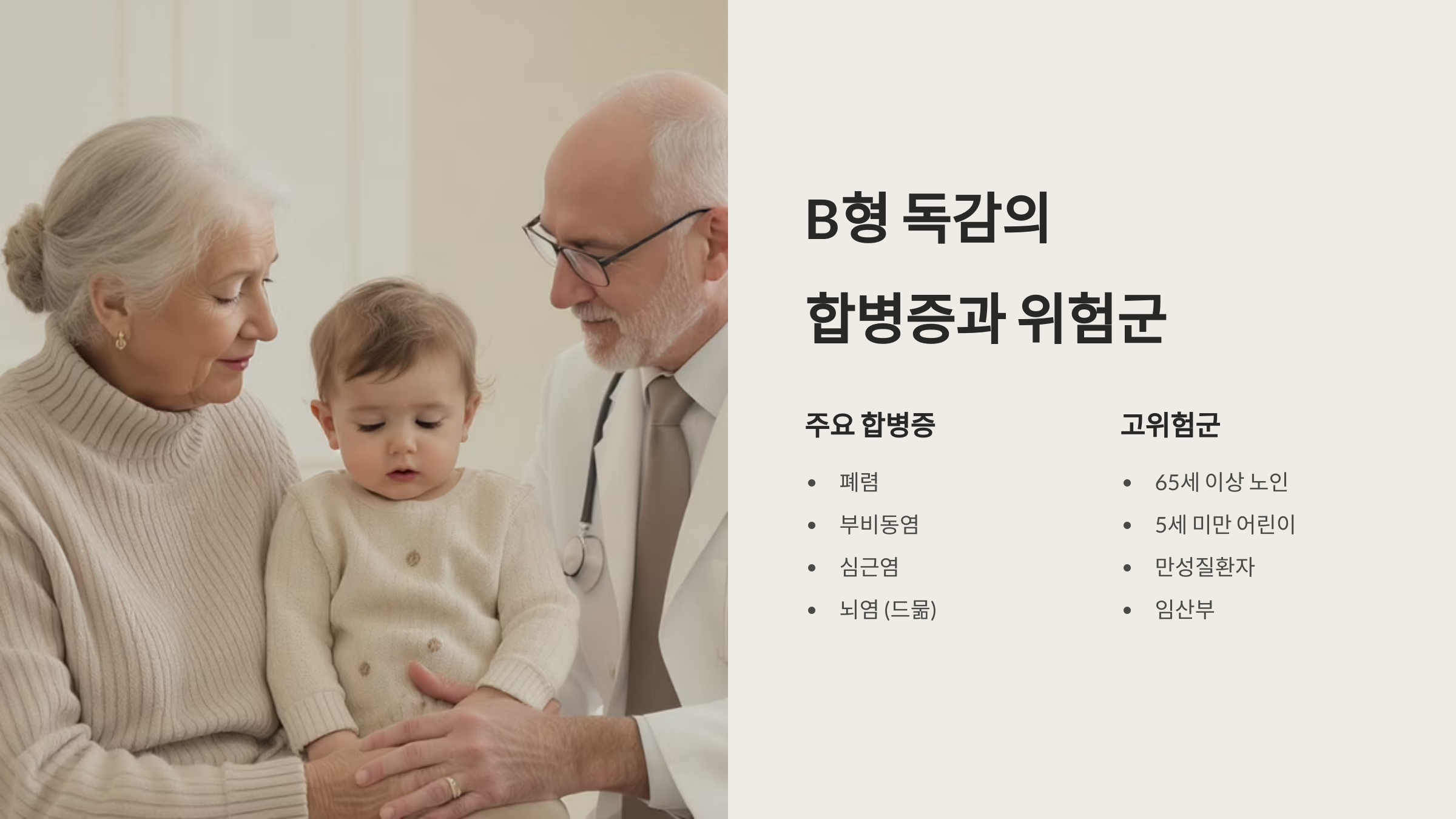 B형독감은 대부분 1-2주 내에 회복되지만, 일부 환자에서는 심각한 합병증이 발생할 수 있어요. 가장 흔한 합병증은 폐렴이에요. 독감 바이러스 자체에 의한 1차 바이러스성 폐렴과 세균이 2차적으로 감염되어 발생하는 세균성 폐렴이 있죠. 폐렴이 발생하면 호흡곤란, 흉통, 가래가 섞인 기침 등의 증상이 나타나고, 심한 경우 입원 치료가 필요해요.