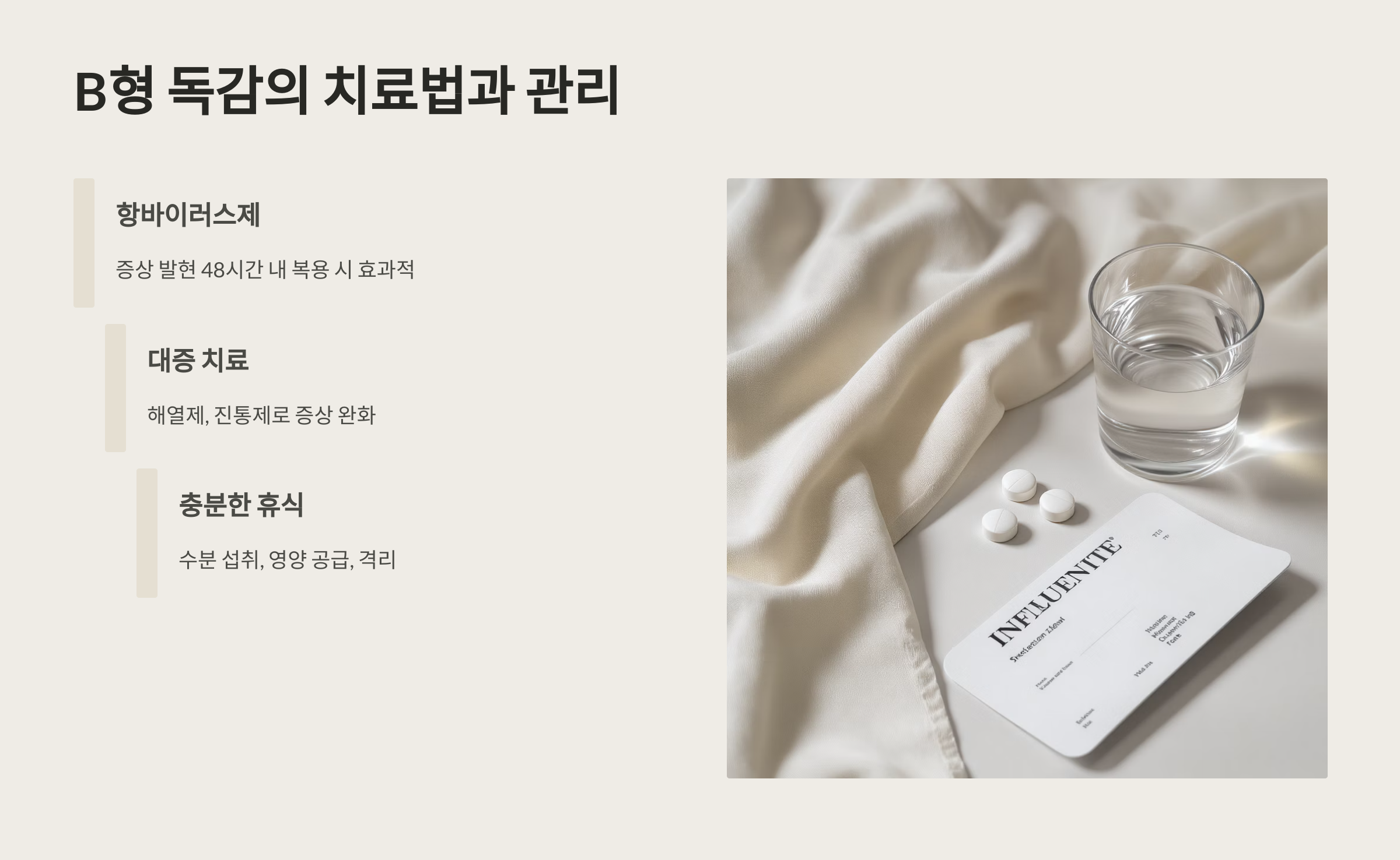 B형독감의 치료는 크게 항바이러스제 치료와 대증요법으로 나뉘어요. 항바이러스제는 바이러스의 증식을 억제해서 증상의 기간과 심각도를 줄여주는 역할을 해요. 가장 많이 사용되는 항바이러스제는 오셀타미비르(타미플루)와 자나미비르(리렌자)예요. 이 약들은 증상 발생 48시간 이내에 복용하기 시작해야 효과가 좋답니다.