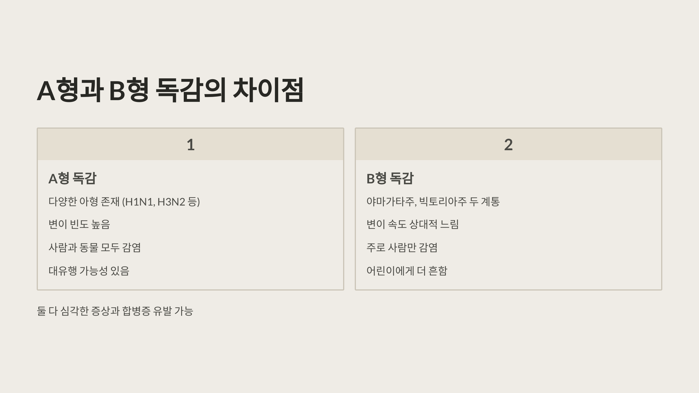 A형독감과 B형독감은 모두 인플루엔자 바이러스에 의한 질병이지만, 여러 면에서 차이가 있어요. 가장 큰 차이점은 유행 패턴이에요. A형독감은 거의 매년 유행하고 대규모 유행(팬데믹)을 일으킬 수 있는 반면, B형독감은 2-3년 주기로 유행하고 지역적인 유행에 그치는 경우가 많아요. 이는 A형이 더 빠르게 변이하기 때문이에요.